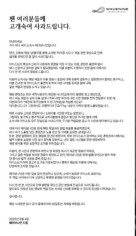 [인물 프로필]바다 (본명 최성희)생년월일: 1980년 2월 28일직업: 가수, 뮤지컬 배우데뷔: 1997년 걸그룹 S.E.S. 멤버로 데뷔주요 활동: ‘바다BADA’ 유튜브 채널 운영, 다수의 뮤지컬과 예능 활동소속사: 웨이브나인(WAVE9)가족: 2017년 결혼, 슬하에 1녀아티스트 바다, 손글씨로 전한 사과문가수 바다가 최근 허위 광고 논란과 관련해 손글씨 사과문을 올리며 대중 앞에 사과했습니다. 유튜브 채널 ‘글램미’를 통해 소개된 ‘미라클 시드니’라는 화장품 광고에 참여했던 그녀는, 제품의 진위 여부에 대해 제대로 파악하지 못한 채 촬영에 임했다는 사실을 뒤늦게 인지하고, 이에 책임을 통감한다는 메시지를 직접 전했습니다.이 사건은 단순한 유명인의 광고 출연 논란을 넘어, '신뢰'라는 가치가 상업..